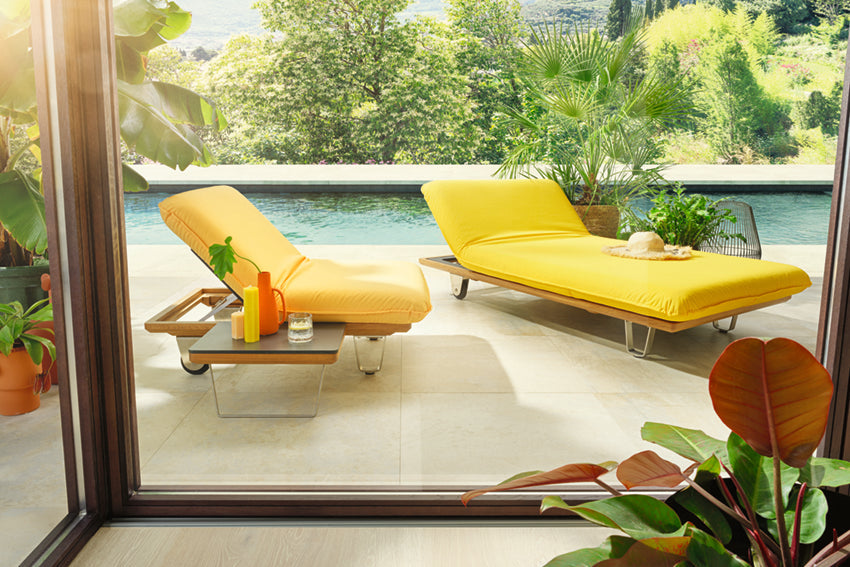 Designed with a cosy upholstered surface, a strong oak frame, and stainless steel feet, the Sojo Sunlounger is built to last while enhancing any outdoor space. With adjustable positions, innovative folding design, and discreet wheels for easy movement, the Sojo Sunlounger changes the pace for traditional sun beds, transforming relaxation into a truly effortless experience.